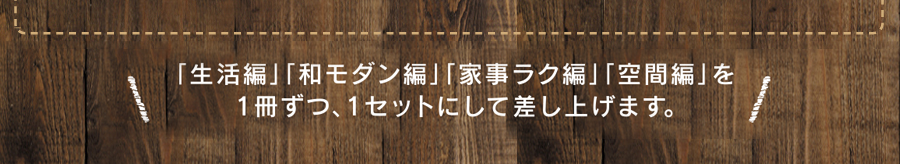 趣味空間など毎日を楽しむ空間を特集した「生活編」、新しさのある和空間を特集した「和モダン編」、を楽しくラクにするアイデア特集の「家事ラク編」、ヴィンテージでハイセンスな手づくり空間を特集した「空間編」をそれぞれ1冊ずつ1セットにして差し上げます。下記フォームよりご応募下さい。