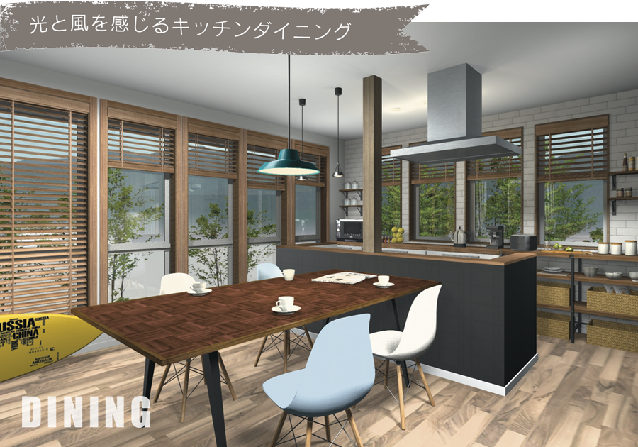 窓に囲まれ、光と風をふんだんに感じながら過ごせるDK。