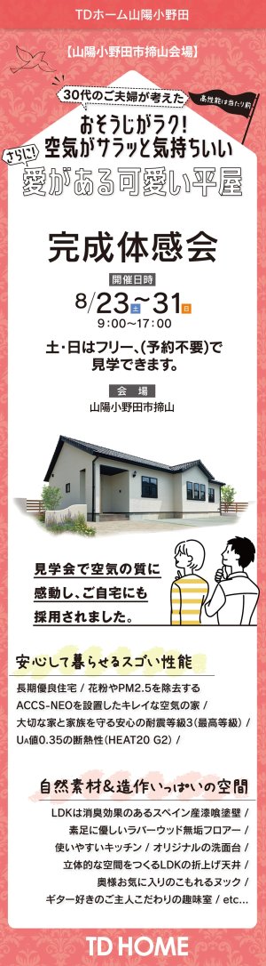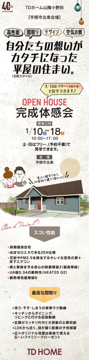 TDホーム山陽小野田は、山口、山陽小野田、宇部で新築の家づくりをしています。今回、山陽小野田市揥山会場で見学会(内覧会・オープンハウス)を開催。