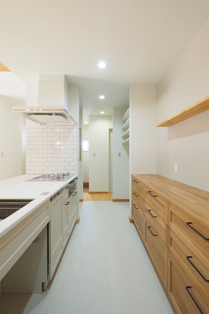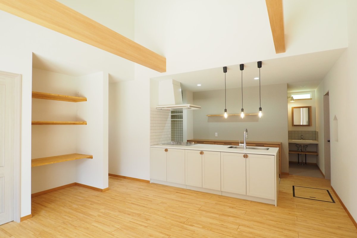 高性能!コスパGOOD!デザイン&プラン力! かわいいだけじゃない! 蒸し暑い日でも室内はさらっと爽やか 地球環境にやさしく、自然素材たっぷり、また家事動線にもこだわったすまいです 工事前 基礎工事 建方工事 屋根工事 外壁工事 断熱工事 内部造作工事 仕上工事 完成・見学会 造作TV台(床下空調) 玄関ホール 造作洗面化粧台 キッチン トイレ パントリー 外観 外観