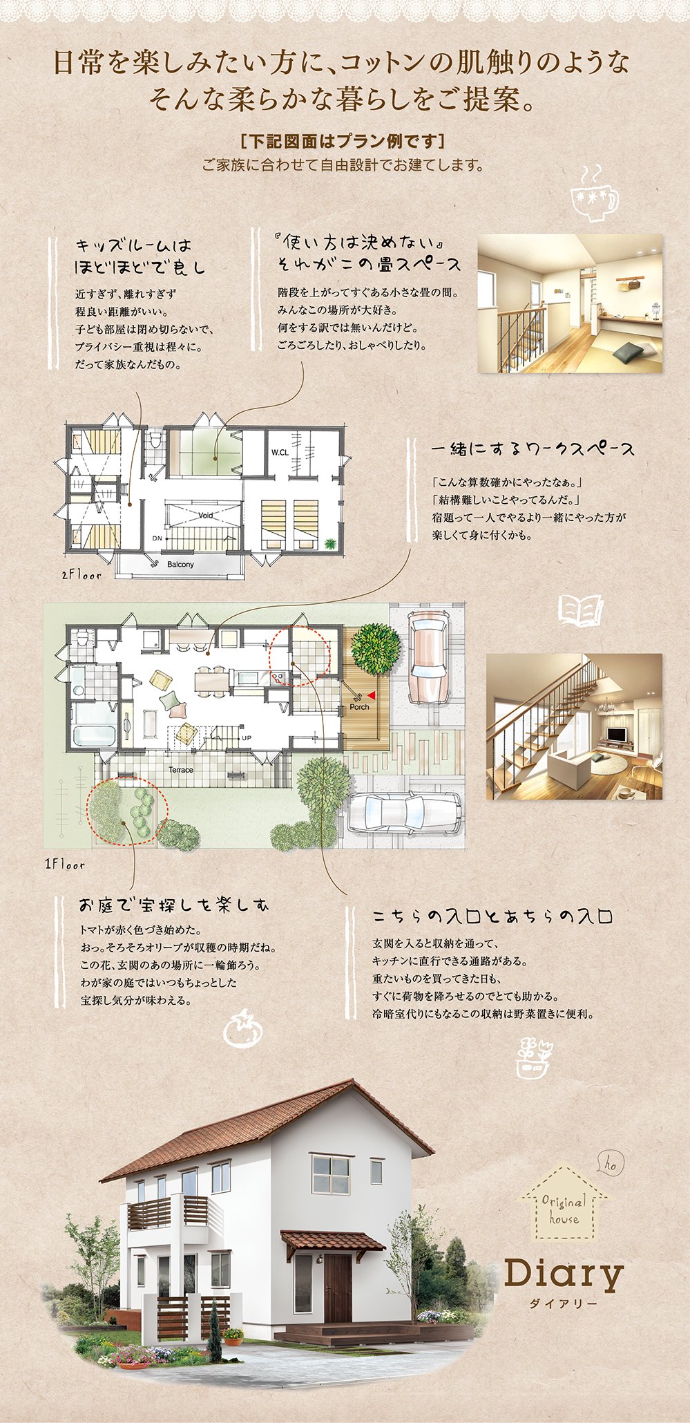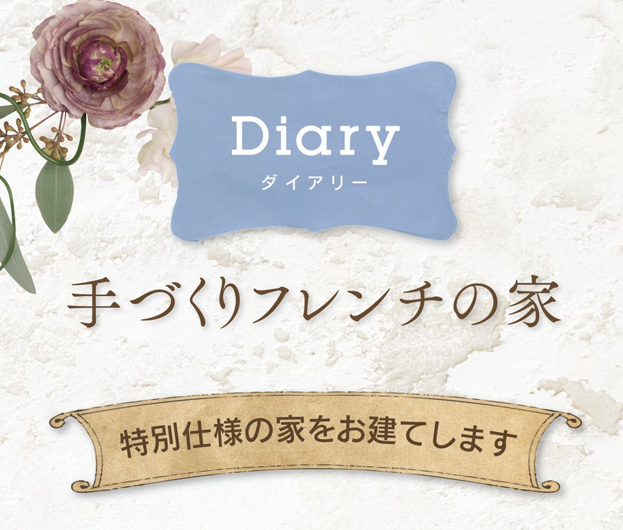 手づくりフレンチの家「ダイアリー」を特別仕様でお建てします。木や塗り壁など体に優しい素材をふんだんに使った、家族思いのフレンチハウス。手づくりが似合う可愛らしい空間に、家事のしやすさにこだわったプランです。家づくりをお考えの方、ご興味のある方、まずはお気軽にお問い合わせ下さい。